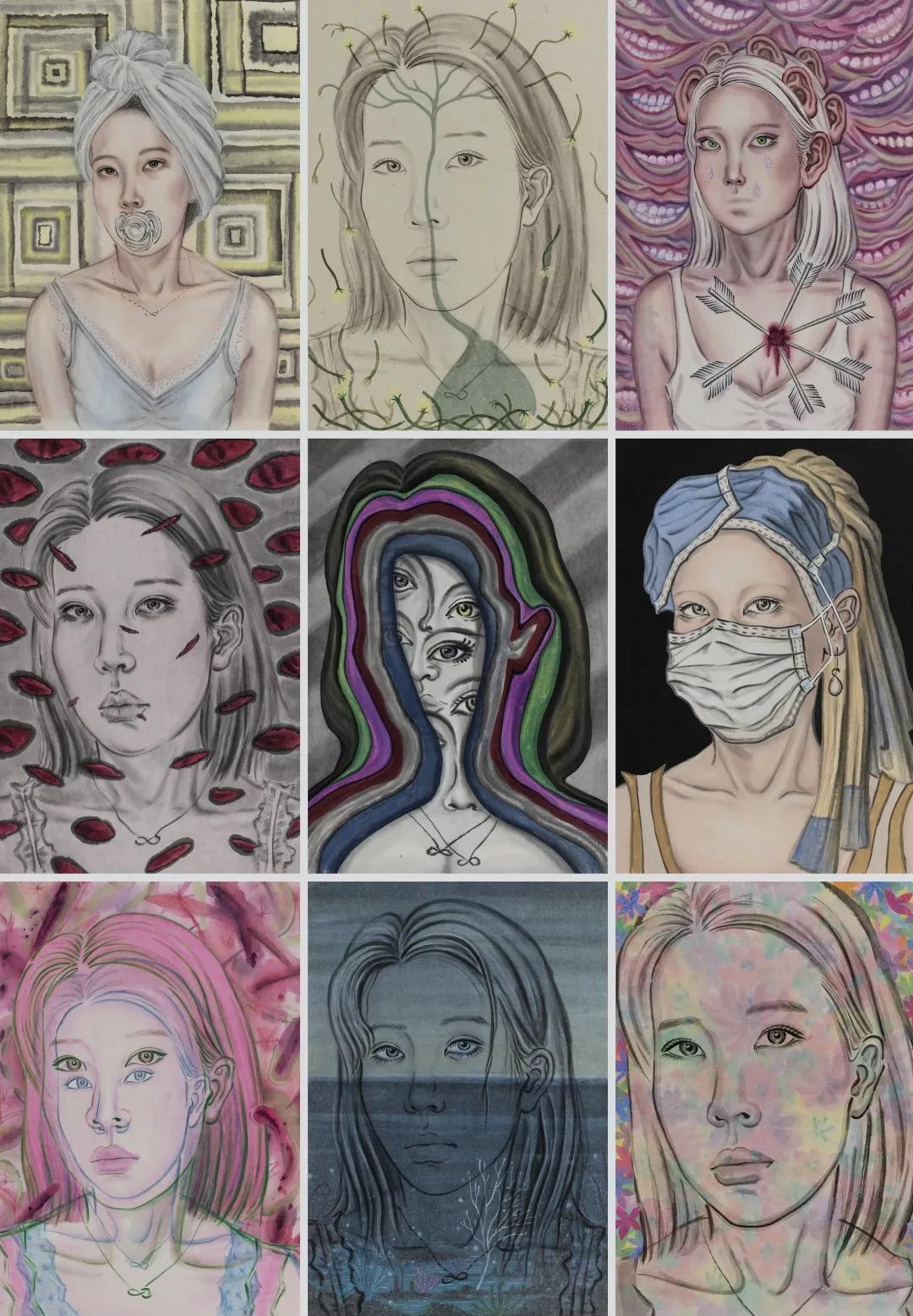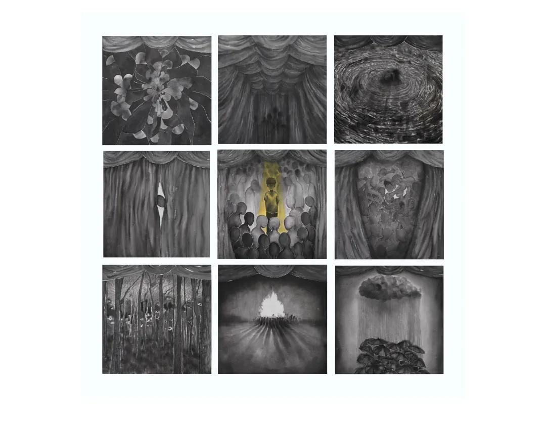作品名称:《内心》 指导老师 :唐凝 刘庆和 林彬 王晓辉 廖勤 王宏州作品尺寸 :45*65cm*9 作品材料 :纸本水墨,颜彩