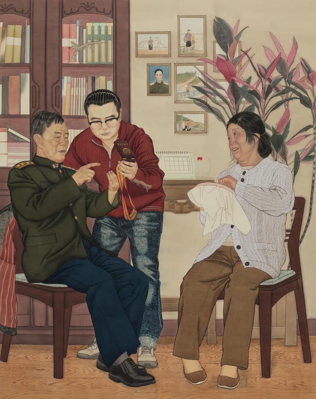 作品名称:《听姥爷说》指导老师:焦洋、张猛、徐华翎、金瑞作品尺寸:175cm*140cm作品材料:绢本设色 综合材料