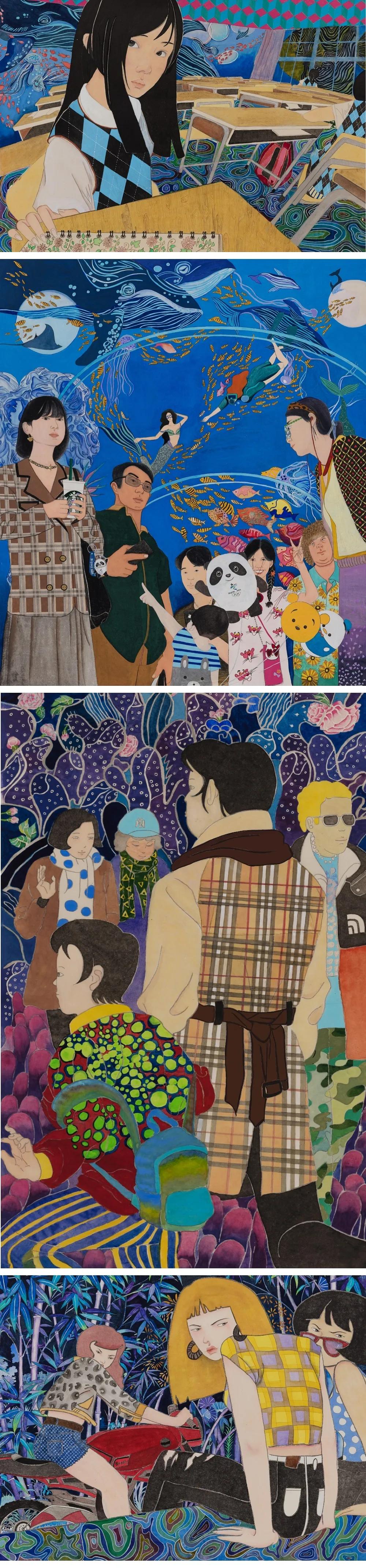 作品名称:《我的黄金时代》《眼里一片海 我却不肯蓝》《重塑巴别塔》《在到处之间找我》指导老师:焦洋、徐华翎、金瑞、张猛作品尺寸:165*145cm 105*75cm 103*86cm 60*90cm作品材料:综合材料