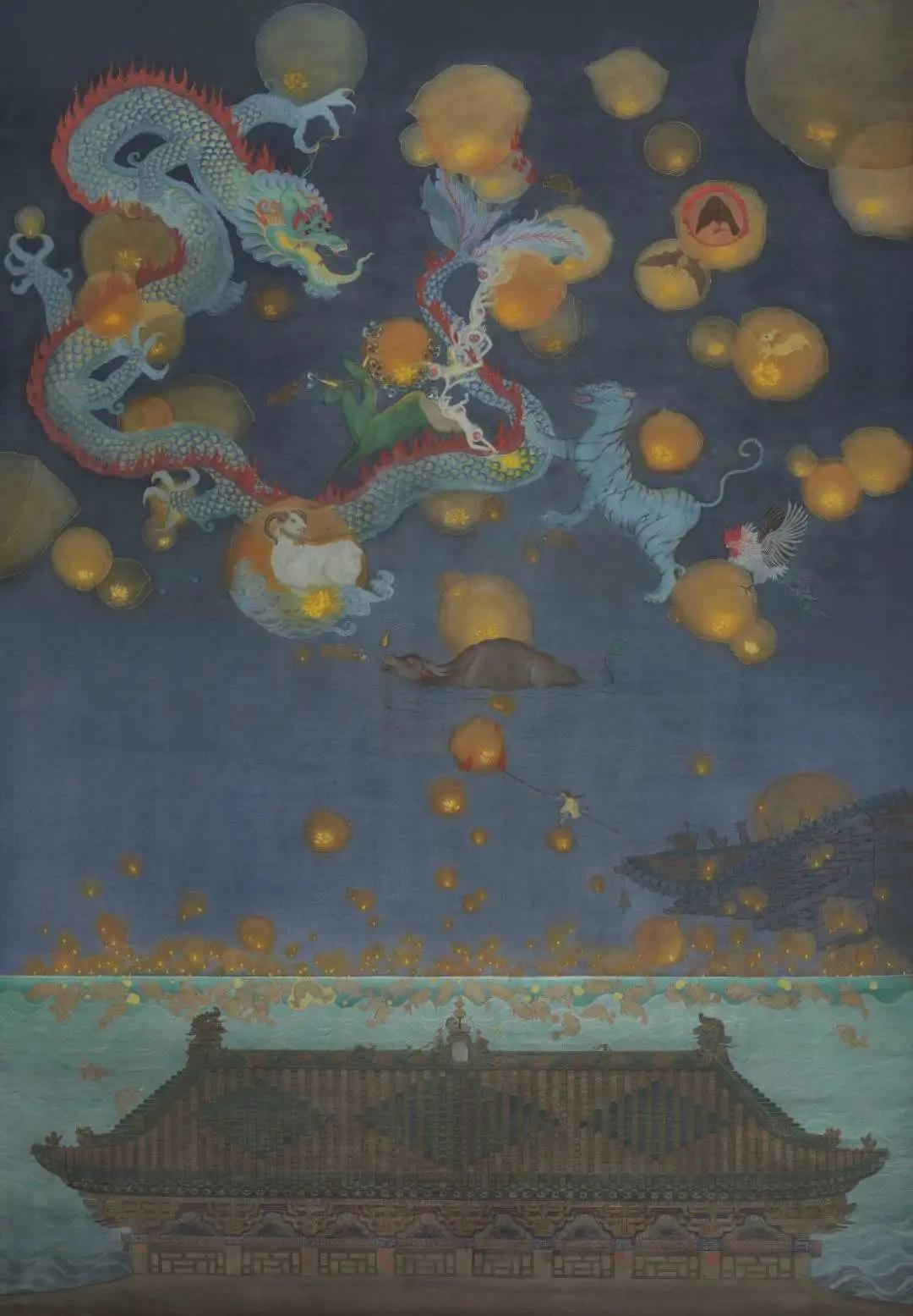 作品名称:《夜游记》指导老师:焦洋、徐华翎、金瑞、张猛作品尺寸:161cm*210cm作品材料:绢本设色 综合材料