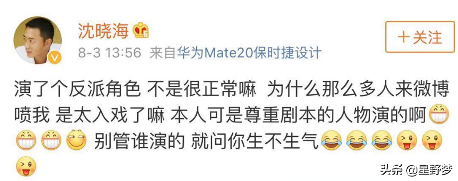 有许多入戏太深的观众去扮演者沈晓海的微博喷金光善,惹得沈晓海不得不调侃回应。