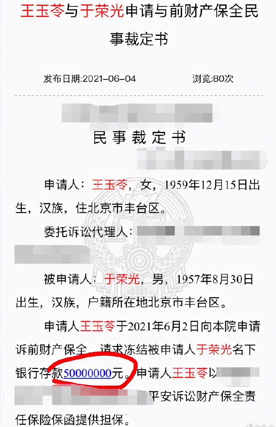有媒体在网上查询后发现早在2021年6月,王玉苓就向法院申请诉前财产保全,请求冻结申请人于荣光名下银行存款5000万,由此看来当时夫妻双方在财产分割这一块有些争议。