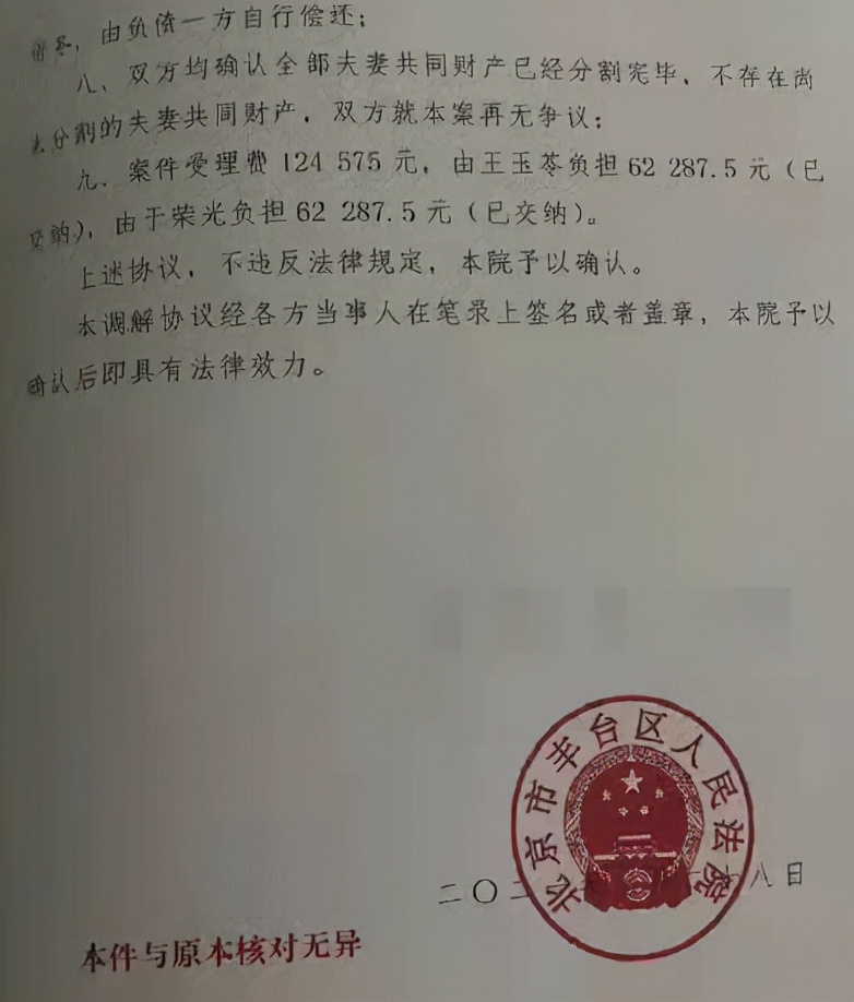 值得注意的是离婚协议中的金钱数字,协议中的第九条写着本案的受理费为124575元,于荣光和王玉苓各自承担一半,双方都已经交纳了这笔钱,据推测夫妻俩分割的财产金额应该在2500万左右。