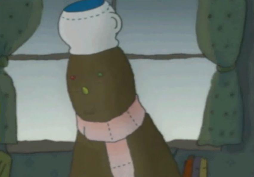头顶着一个痰盂,卷筒纸的围脖,眼睛鼻子好像是昨天没消化完的豆子。