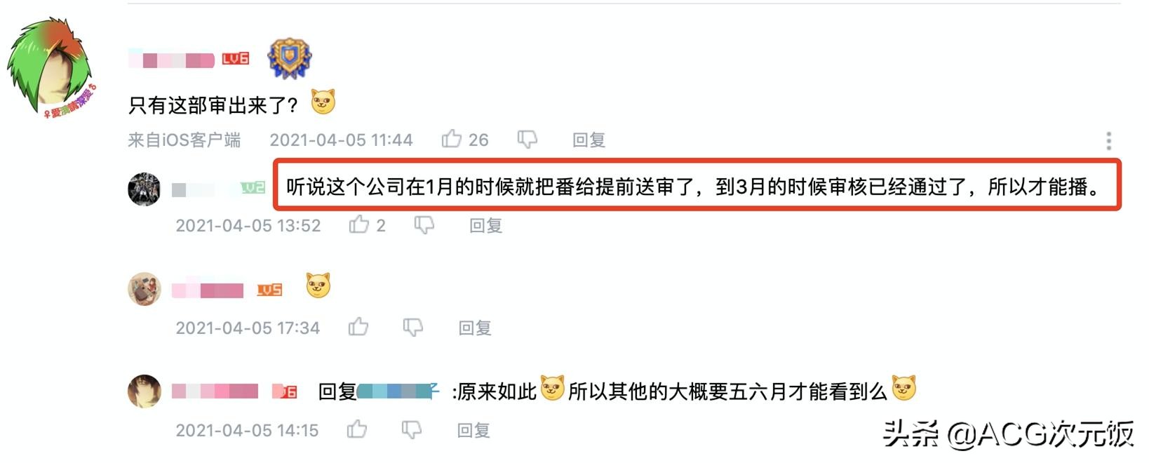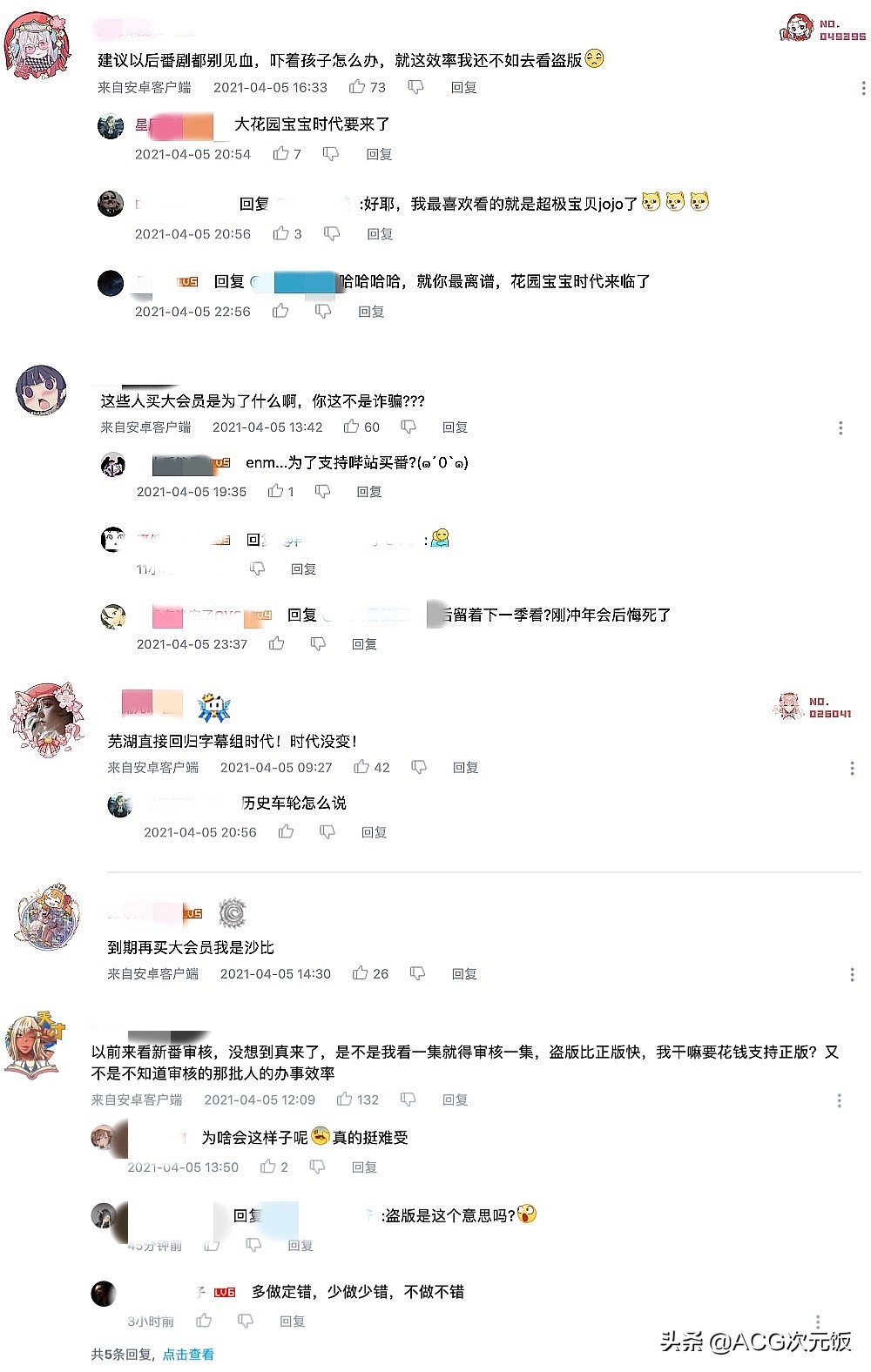 那些没有同步播放的四月新番,则很多网友都在pv下追着吐槽,大部分都是说为什么自己要续费,续这大会员有何用。如今这些新番全部都要经过审核,可假若是开播一集就要审核一集,可审核速度慢,盗版第二天就能出,那真的好多网友都会选择直接看盗版了。