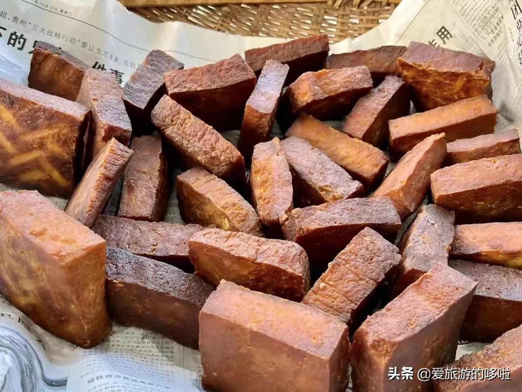 除了泡豆腐,贵阳人家里另一个会常备的是烟熏豆腐——这个豆腐是用香料涂抹后再用木炭与米糠进行腌制的,所以自带盐味。和泡豆腐一样,烟熏豆腐也好保存,买一块回家只要不切开可以放上许久,一般炒回锅肉的时候,一定会切几块烟熏豆腐搭配。