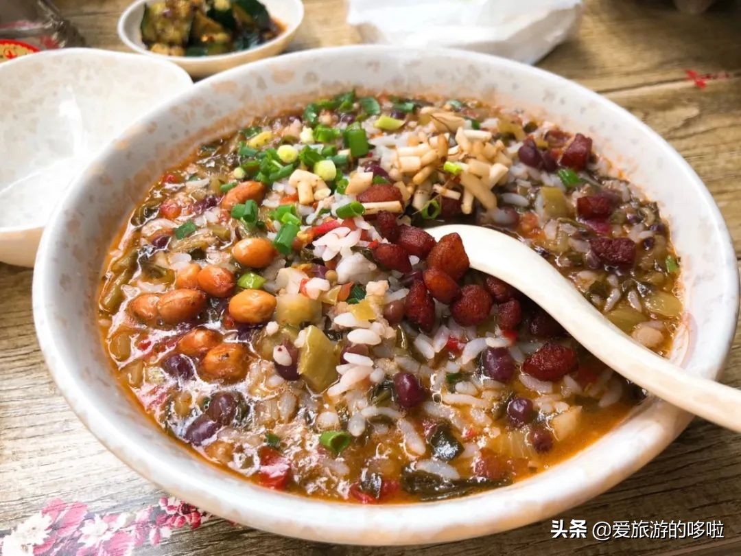 酸菜豆米的升级版就是酸菜豆米烫饭了,把做好的酸菜豆米汤里加上米饭,一定要加肉末,没有肉香味的酸菜豆米烫饭没有灵魂。不过现在也有人喜欢把酸菜豆米饭的花芸豆改成小豆,说是小豆的口感会更细腻,吃起来更顺滑。其实都好吃,最后来勺折耳根与脆哨,酸菜豆米就会变得更丰盛。