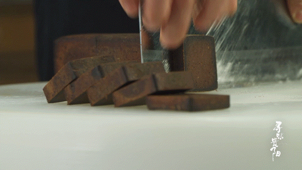 豆豉粑一买一整块,根据不同菜的需要,会把它切成小块来使用。如果是做油辣椒,会需要几个切出的大块与油和辣椒融合;如果是做蘸水,小小两片薄片剁碎混合就好。