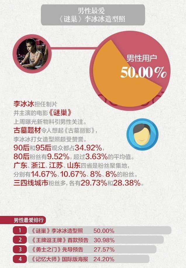 值得注意的是,李冰冰《谜巢》造型,最吸引用户群为男性。正在上映的所有影片中,李冰冰造型赢得男性最爱电影造型,占比高达50%。