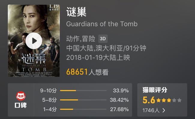 李冰冰担当制片人、女一号的好莱坞影片《谜巢》已经上映,而首日上映后,猫眼电影评分仅为5.5分。但从专业人士角度评析该部电影,评分应该是更高的。