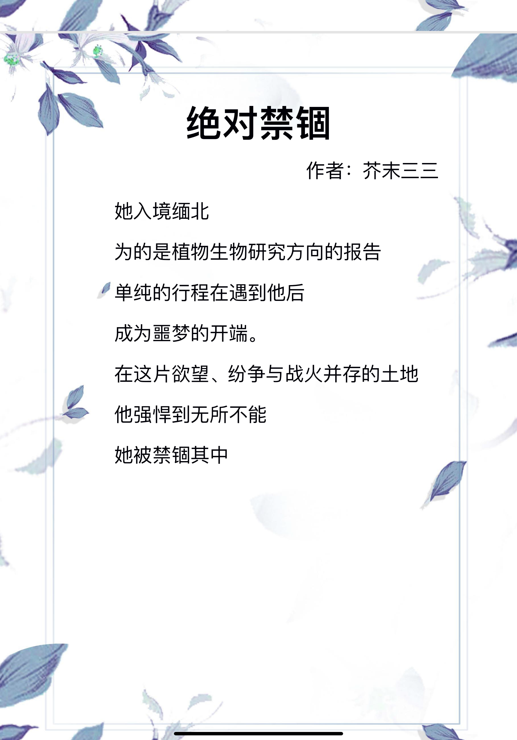 书评:女主是一个植物学家,她进入缅甸是为了一份珍贵植物的研究报告,男主是缅甸军官,她与男主开始谈恋爱是自愿的,后来男主把她带入一个偏僻的军事基地,男主骗她,不允许女主回国。之后女主逃跑无数次,每次都被男主抓回来……