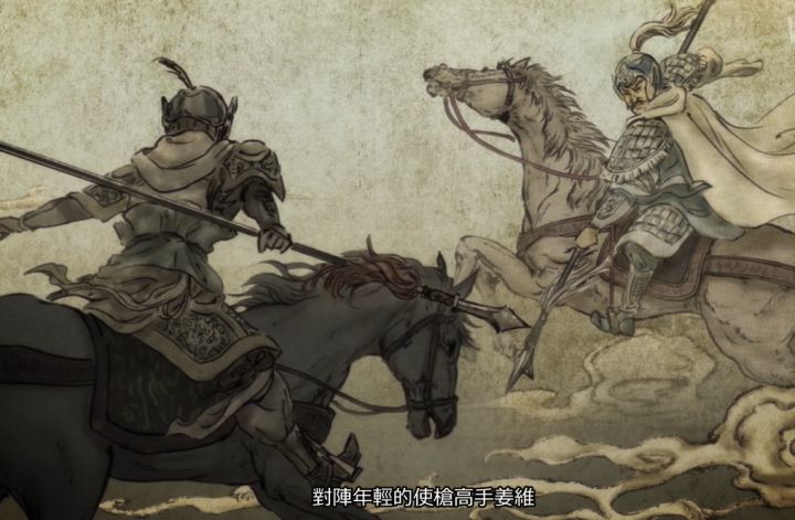 回顾上集内容时提到了赵云和姜维的单挑,虽然作品里姜维用的是剑不过在解说里又换成了用枪,不知道算不算是制作组的一种修正,增谷康纪还用严肃的语调模仿了孔明说唱里的hey-ha(兵法)。