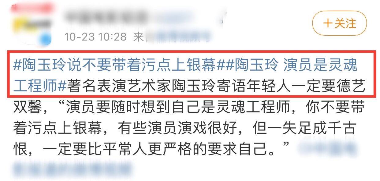 这次她参加活动接受采访时,劝诫年轻演员要努力做德艺双馨之人,直言:“不要带着污点上银幕。”