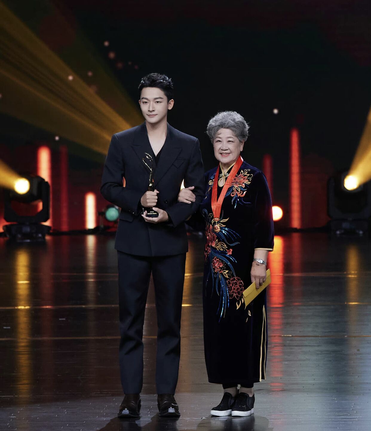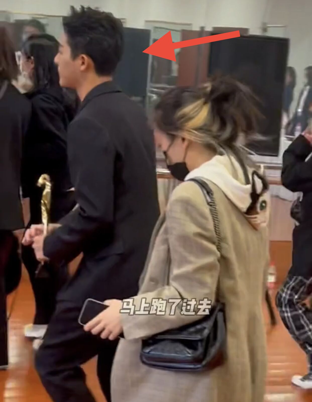 张晚意领了奖之后,似乎还有工作需要处理,于是准备离开现场。但他突然看到老艺术家陶玉玲步伐缓慢地独自往前走着,便快速地一路小跑到对方身边。