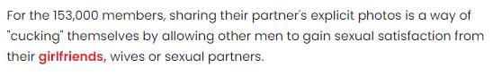 但绿帽组并不是唯一的存在,与之类似的还有reddit上的“妻子果照交易”小组。和绿帽本质相同,都是为了一己私欲,在未经同意的情况下将他们的伴侣暴露给其他人。