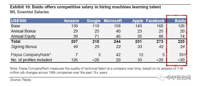 据高盛统计,与亚马逊、谷歌、微软、苹果和facebook相比,百度为机器学习(machine learning )科学家提供的基本年薪为12.6万美元,仅位列六家企业中第五位。facbook凭借16万美元的年薪位居第一。