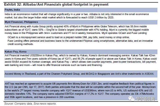 高盛十分看好阿里旗下的蚂蚁金服,认为蚂蚁金服将成长为全球最大的金融科技公司。目前,蚂蚁金服覆盖了全球32亿的人口,付款数据覆盖了7.17亿消费者,其中包括4.54亿的中国在线消费者,以及1.8亿印度使用paytem的人口。
