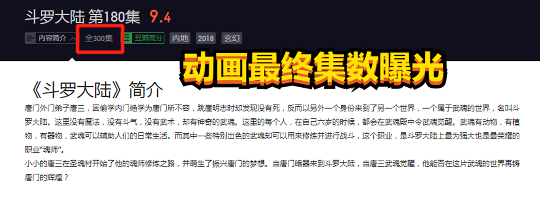 木子在这一次和朋友的聊天中偶然看到了一个截图,朋友说找下亮点,木子立马就看出了“《斗罗大陆》全300集”的这个标记,这着实让木子大吃一惊。在去腾讯视频确定了消息的准确性之后,木子也是相信了《斗罗大陆》一共会有300集的这个消息,而且这次《斗罗大陆》动画集数曝光应该也是最近的事情。