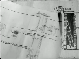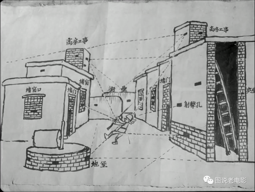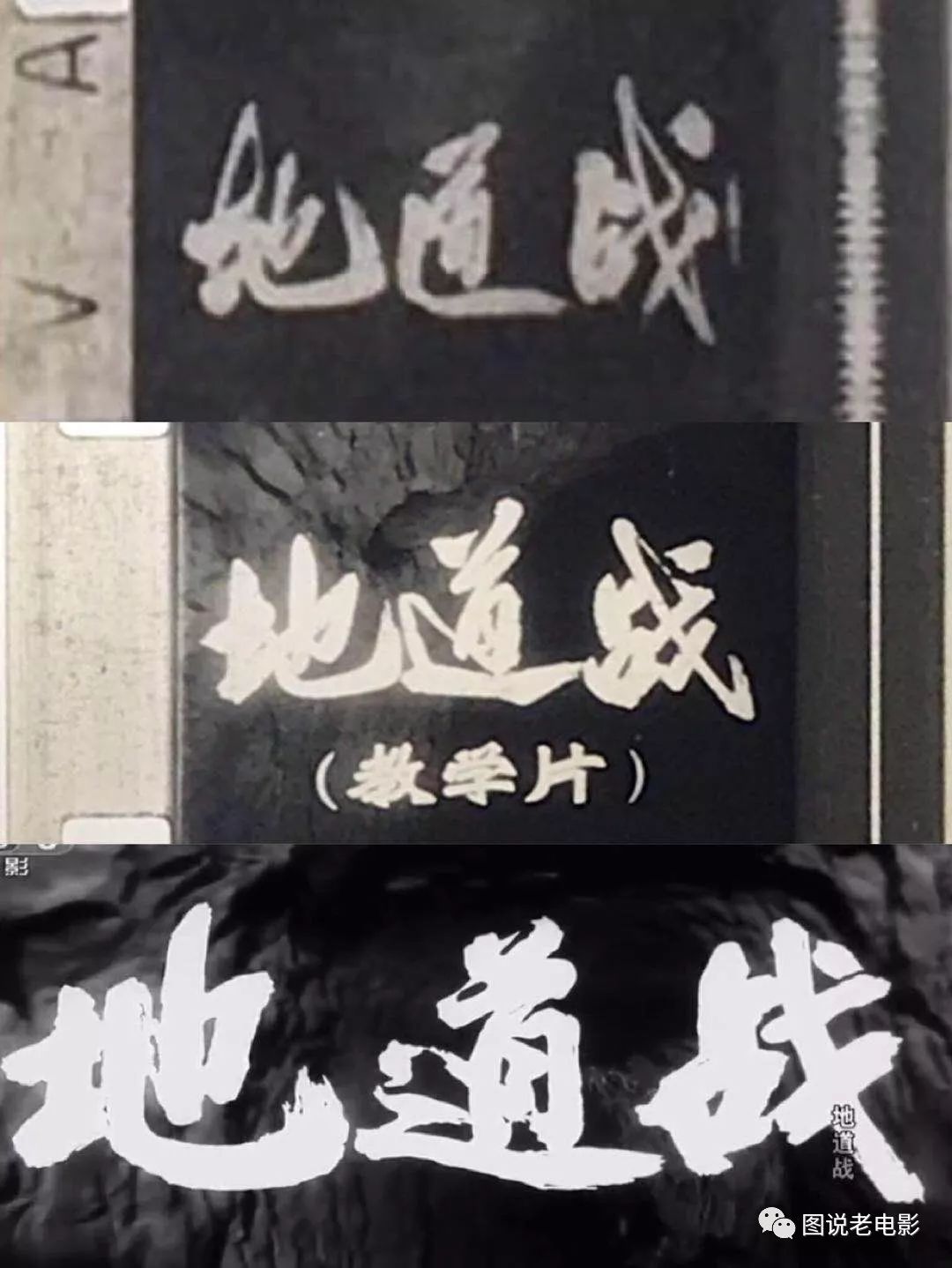原来最早的版本是在钟声和音乐主旋律中推出片头“地道战”,然后是职员表,66年元旦的时候发行上映。文革时把这些片头都去掉了,变成现在的这样。真正在地道中拍的,也就是片头出字幕这段,包括后面进攻,高传宝和民兵在地道里跑,摄影师在后边追着……这是在顺义县焦庄户有这个地道,真正的冉庄地道是直不起腰的,没办法布置摄影灯光。其他在八一厂厂内拍的景,灌水、放烟、扎个枪什么的都在是厂里搭的景。刘江那个汉奸死都是在厂里拍的,炮楼戏是在小礼堂拍的,搭个景。