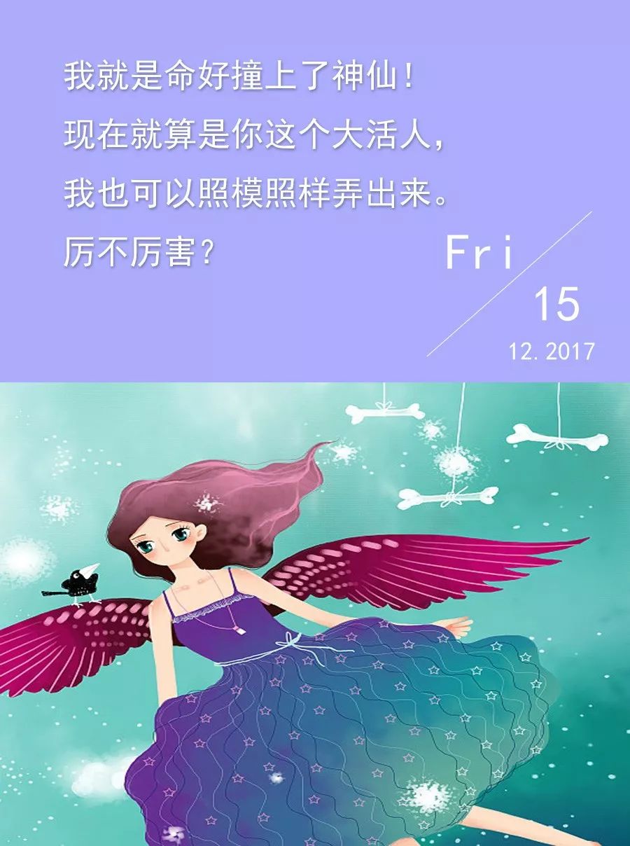 “瘸子又如何,我可以治好;长得不好又如何,不过皮肉表象。我嫁给他,赐他巧手,借他双翼,使他拥有点石成金的法力。可我不知道他那么聪明,偷偷藏了灵符来封存我的双翼,企图永远占有。”
