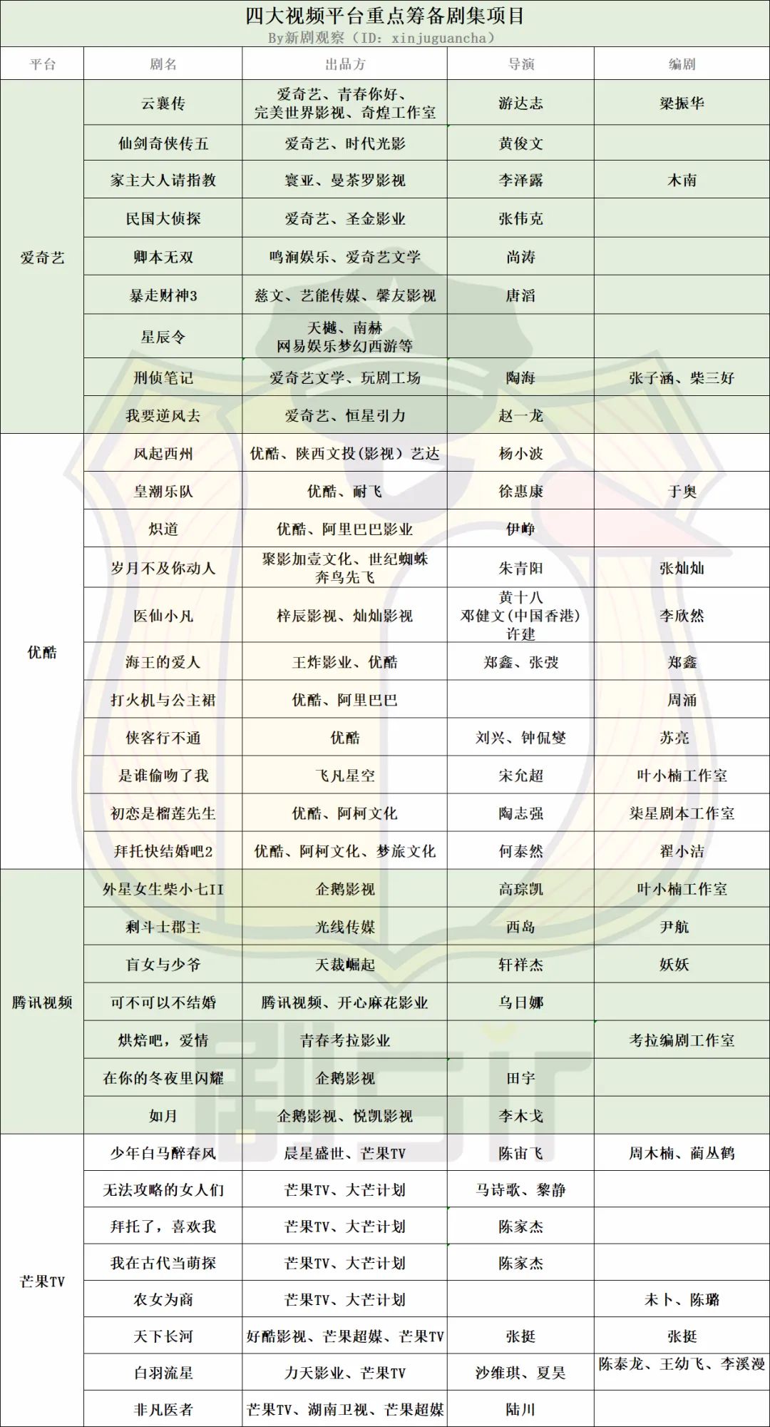 7月之后横店影视城又出于繁荣拍摄的景象,剧组开机的讯息猛涨。横店这边正在如火如荼地拍摄抢时间,而北京的几大剧组筹备酒店也贴满了组讯。新剧观察(id:xinjuguancha)整理了优爱腾芒四大视频网站正在筹备的项目片单,据不完全统计有30余部。