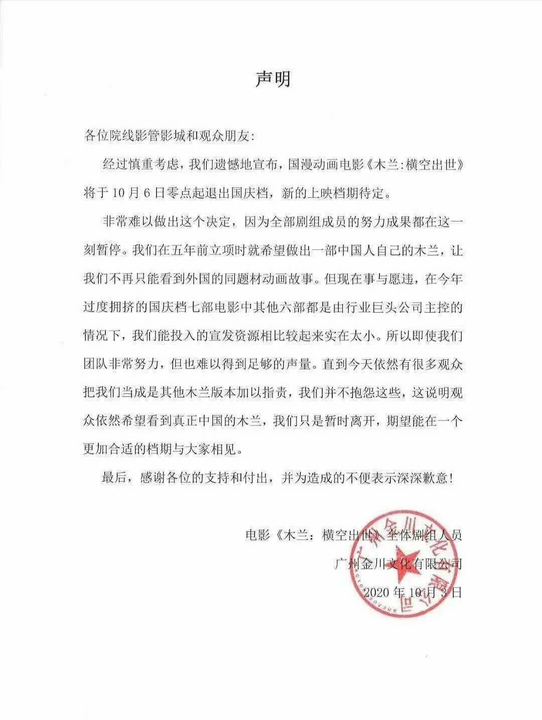 10月3日,《木兰:横空出世》官方发布声明宣布电影将于10月6日撤档,而撤档理由是因为团队在国庆档投入宣发比不过同期上映电影,国庆档竞争太过激烈,而电影宣发资源投入相对太少,该片之后将会再择期上映。