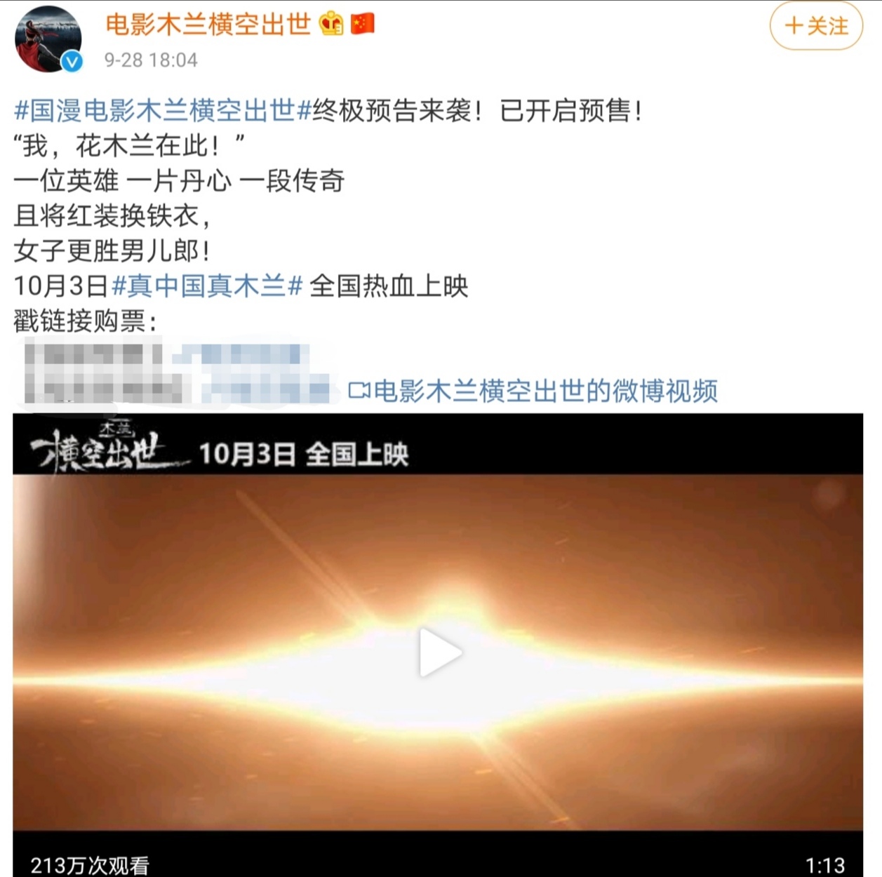 9月28日,官方还在进行电影的最后宣传,在这天,电影发布了终极预告,通过宣传"中国木兰"作为核心,并同时开启预售,电影采用动漫的方式,和前段时间上映的《花木兰》题材相近但又存在着一丝差别。
