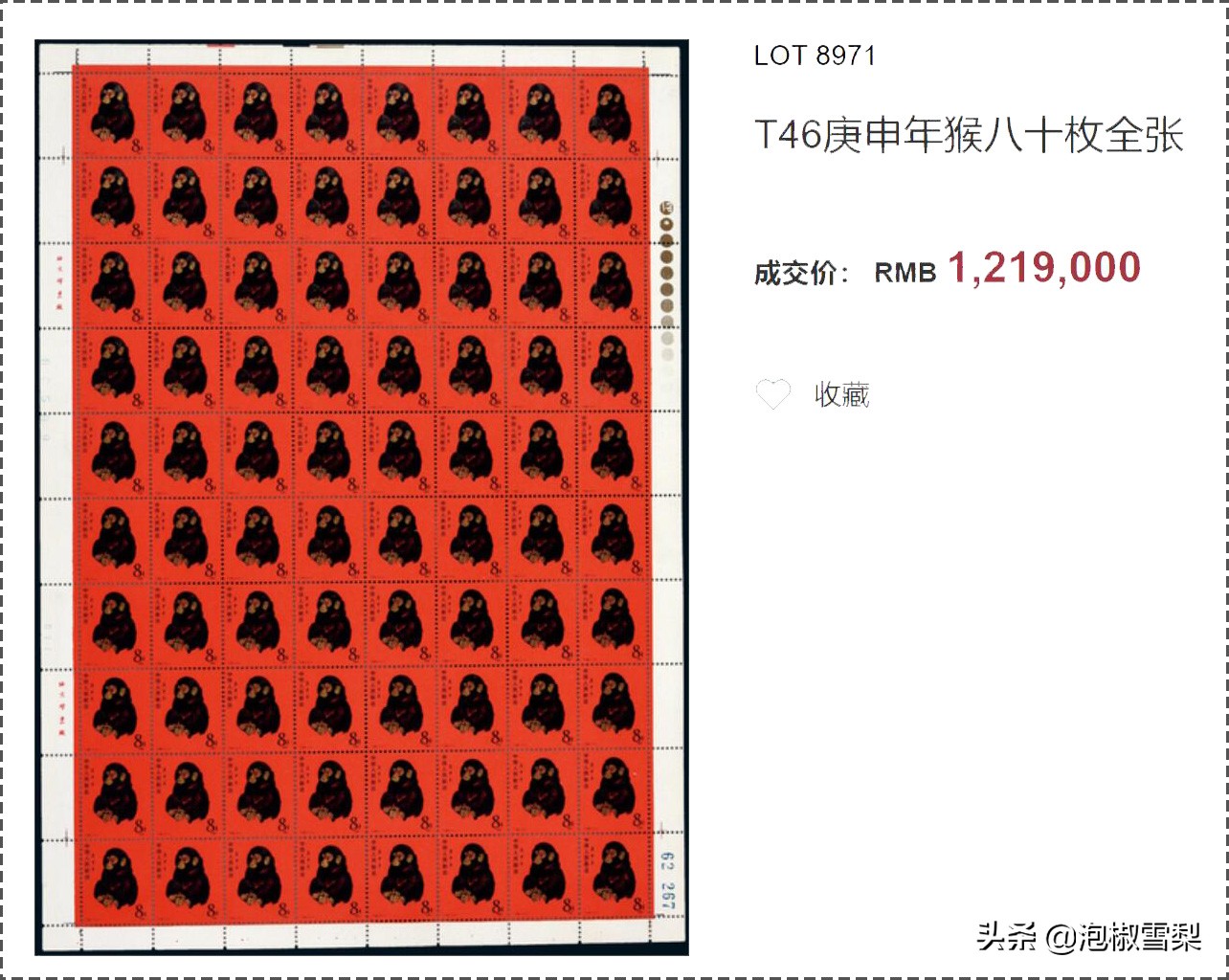 不过随着集邮的兴起,中国第一枚生肖邮票还是展现了它“龙头”的威力,从8分的面值一路涨到13000元,大版更是在近些年涨到了120万元的高位,成为八十年代至今,唯一位列中国珍邮行列的邮票。