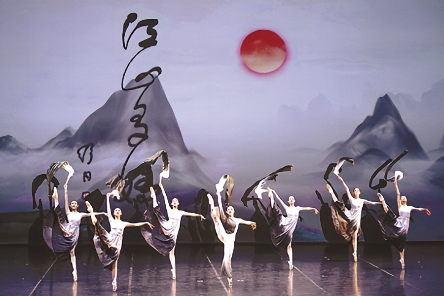 舒均均不仅是中国书协首任主席舒同先生的千金,也是北舞毕业、中芭成长的资深编导家。从她1985年初出茅庐的大型芭蕾舞剧《觅光三部曲》、1986年的《黄河》双人舞、1988年的独幕芭蕾舞剧《兰花花》、1997年的大型芭蕾舞剧《二泉映月》,直到2011年在第二届“芭蕾创意工作坊”推出的《心灵密码——我和我的父亲》,以及此番奉献的芭蕾诗剧《舒体之魂》节选版,年届75岁的她可谓宝刀不老,创意不断……整个作品虽然只有“父亲”这一位男主角,却为他安排了戎装“老红军”和便装“书法家”的双重身份,并以“中华女神”的女子独舞、“墨韵仙子”的男子独舞,以及16位演员的墨韵仙子群舞,为整个作品创造出一个虚实相生的想象空间,由此展示出这位成熟编导家对舞中人物和舞台空间的运筹帷幄。与11年前的《心灵密码——我和我的父亲》相比,这个作品不仅在规模上,从那段表现父女亲情的双人舞拓展成了11年后的诗剧,而且在审美上拉开了某种“距离即美”的广阔空间,更在传播上创造出更大的受众群体。与此同时,舞台天幕上那高悬的一轮红日、流动的云雾山川、飞舞的凤凰和蛟龙、舒爸爸自成一体的经典话语等丰富的视频效果,均为整部作品增添了呼之欲出的立体动感。