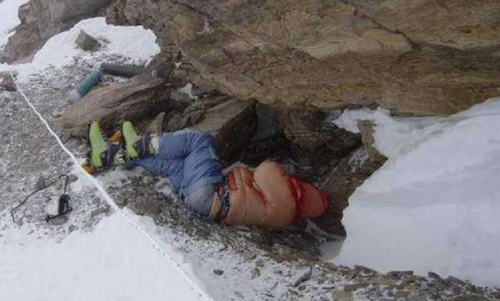 在珠穆朗玛峰最危险的北侧登山道路上,所有人都会看到一具卧在积雪当中的遇难者遗体。
