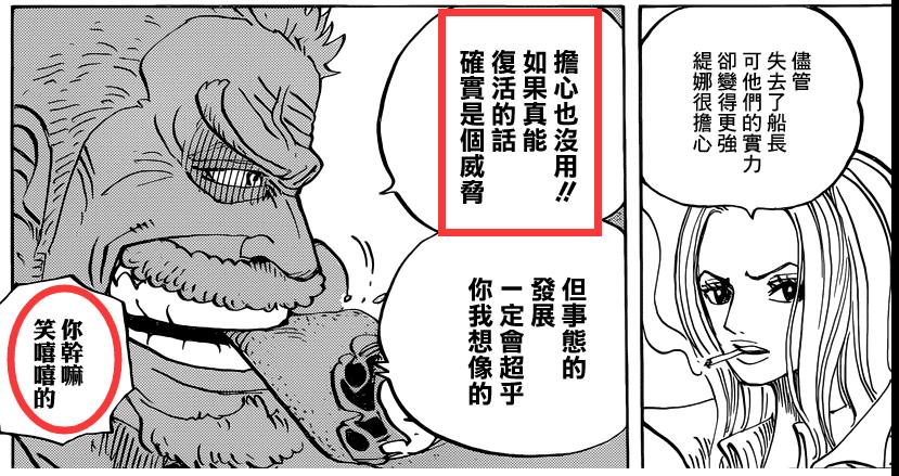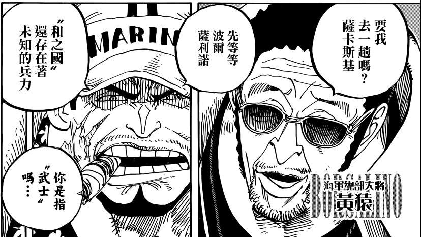 另一方面,在得知大妈和凯多的阴谋之后。这边黄猿是申请自己过去处理,但是看样子赤犬不是很给面子。所以最终是去不成了,而大家把注意力转移到英雄卡普这里,希望他能有所动作。