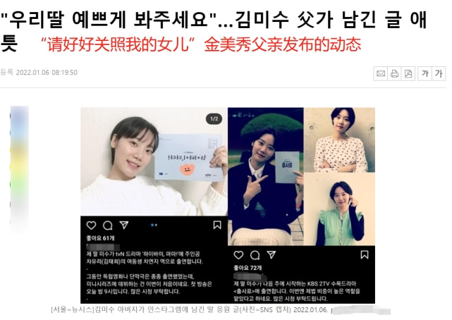 事实上,金美秀父亲社交账号中,发布的关于女儿的这些动态,都是在一年多以前。其中,韩剧《你好妈妈,再见!》上映时,金美秀父亲为女儿做宣传:“我的女儿美秀将出演电视剧《妈妈你好》饰演主人公车宥利(金泰希饰)的妹妹车妍智。 请多多观看。”