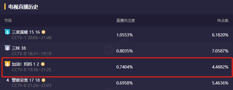 眼看着,网络剧打得火热,这边的上星剧当然也不服输。最新上线的电视剧《加油!妈妈》作为一部新剧已经成功以0.7的直播关注度挤入收视榜单的前三。就连口碑表现不错的《警察荣耀》都成了《加油!妈妈》的垫脚石。
