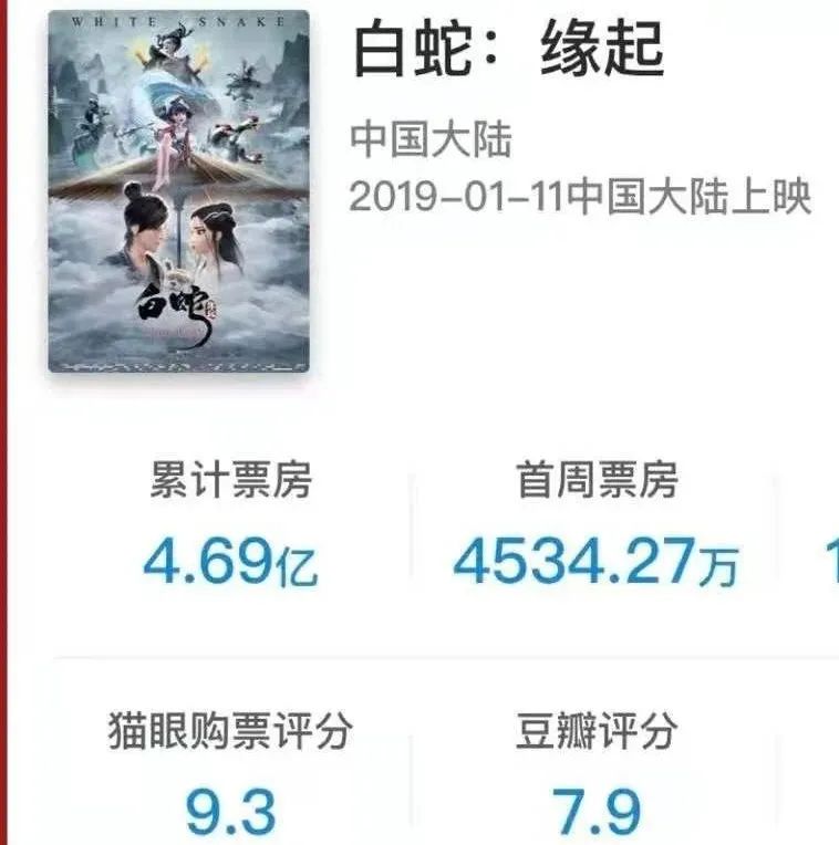 后来却凭借豆瓣7.8 的高口碑逆势上扬,在上映的第21天蝉联四天票房冠军,终收货4.69亿票房,成当年最大黑马。《白蛇:缘起》之所以被誉为“国漫之光”,其成功原因无疑是多方面的。