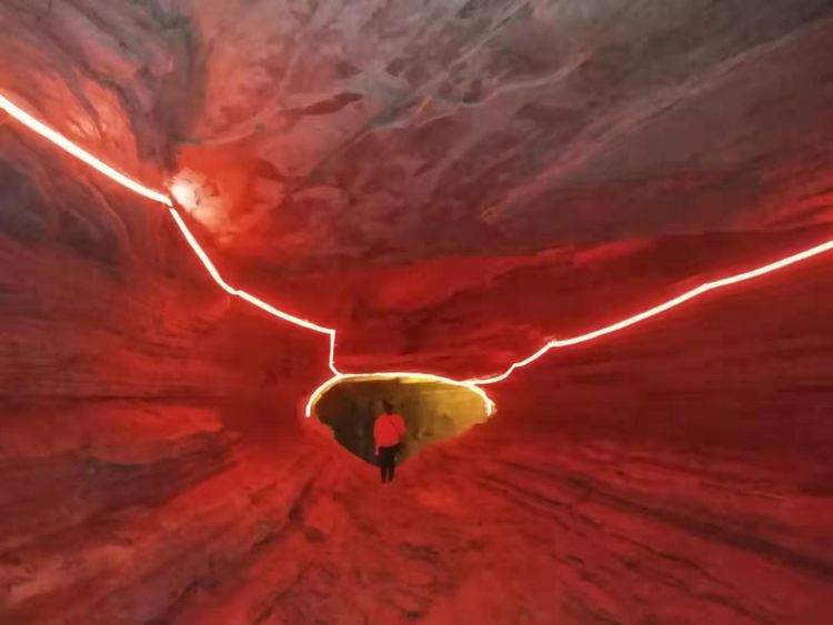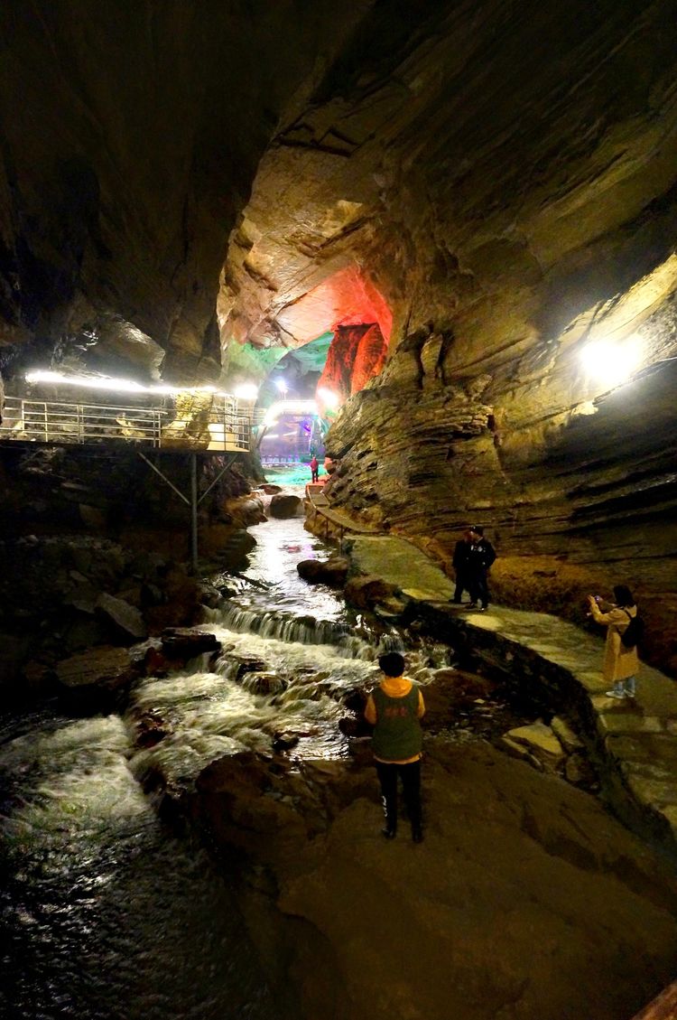 穿过圆形的隧道,眼前豁然开朗,别有洞天,宽阔、高大的洞,好似一个巨大的穹窿,迂回环绕好几层,确是一个迷宫。洞内河水湍急,水声哗哗作响,震耳欲聋。