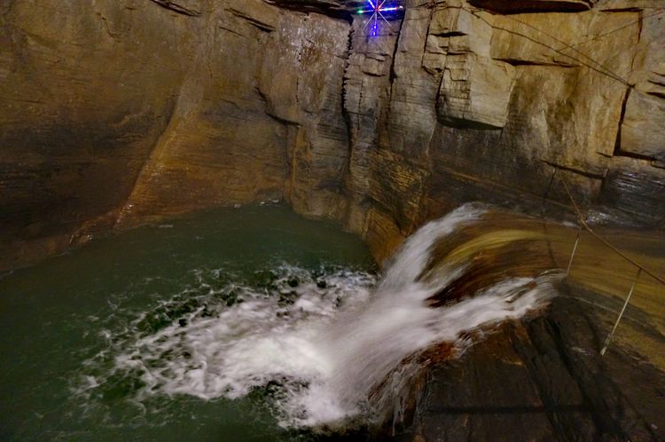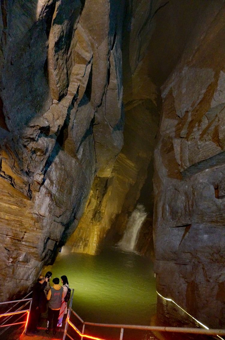 进至洞内,便是远处看见的小房子,几台发电机在轰鸣。 出电站,往右行是莲花池,硕大的莲花状钟乳石挂在头顶的崖壁上,底下是幽深的潭水。