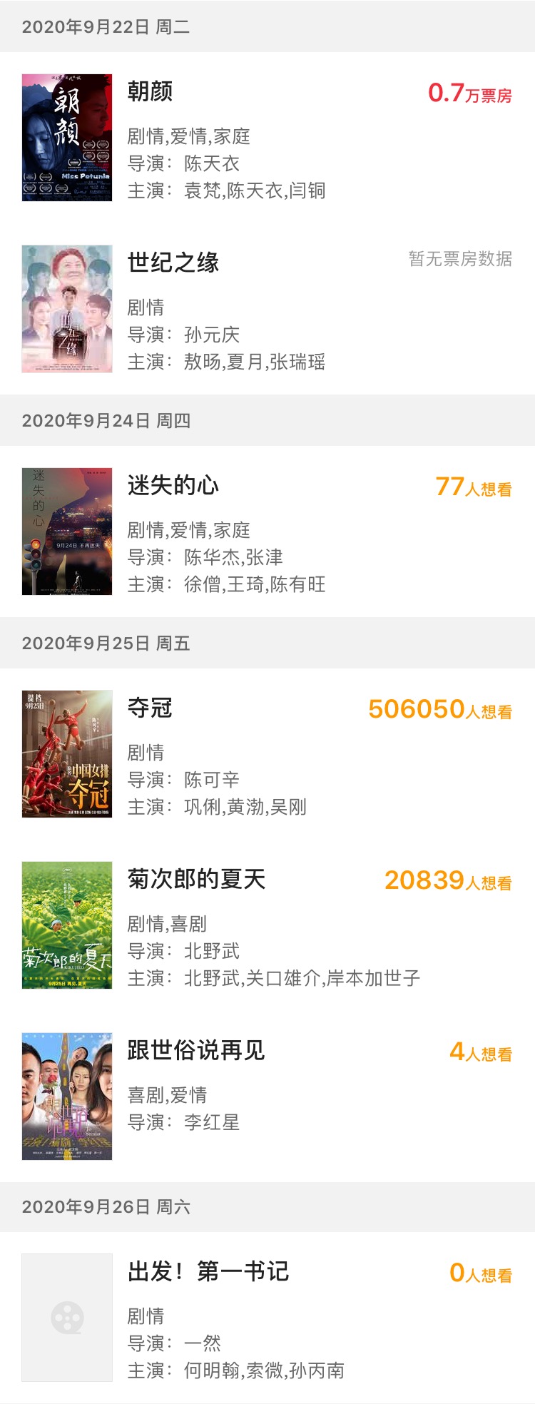 除了以上两部电影之外,本周新片还有爱情电影《朝颜》《迷失的心》,喜剧片《跟世俗说再见》,以及《世纪之缘》和《出发!第一书记》,共计7部新片上映。你最想看哪一部呢?