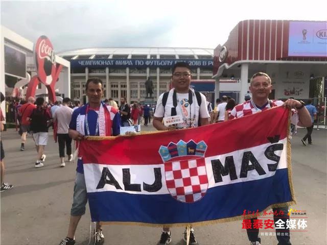 距离比赛开始只有不到一个小时,大部分球迷早已进场,球迷通道的人并不是特别多,最泰安全媒体记者和来自克罗地亚的球迷一起合影,留下珍贵的瞬间。巧合的是,记者购买的决赛球票正好在克罗地亚球迷方阵的右侧,刚进场就被克罗地亚球迷的强大气势。