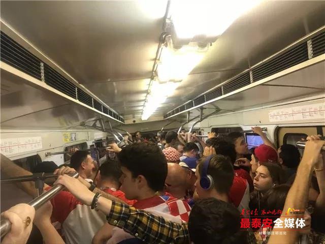 决赛,总是激动人心的。前往卢日尼基体育场的路上,记者就已经感受到决赛的氛围。地铁 1 号线直达球场,当记者坐地铁经过红场时,大批克罗地亚球迷涌入地铁,他们一起唱着跳着,营造出热闹的氛围。距离球场越来越近,球迷越聚越多,车厢里有些闷热,但无法阻止克罗地亚球迷的歌唱。