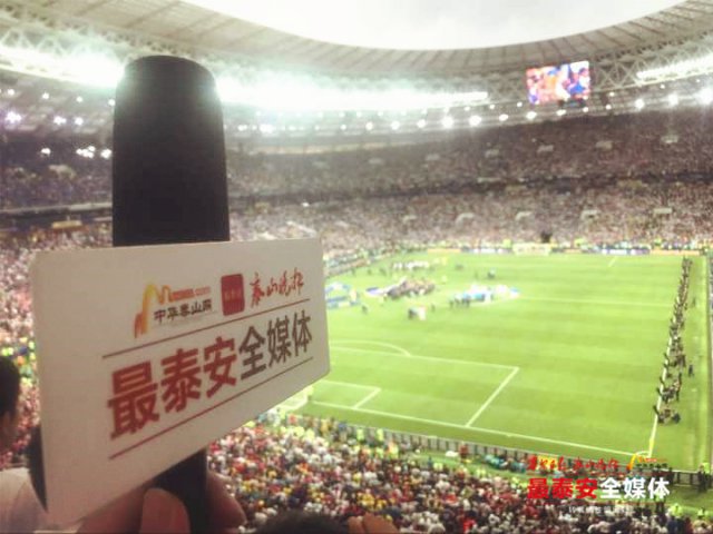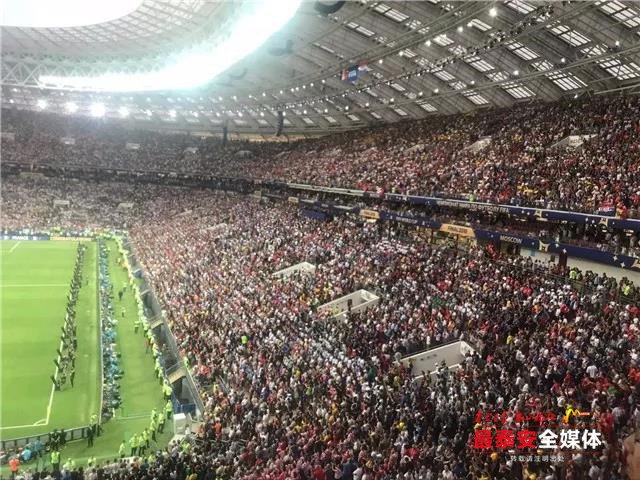 7 月 15 日的莫斯科,最高气温 28 度,有些闷热。卢日尼基体育场内座无虚席,世界杯决赛争夺,法国对阵克罗地亚。最泰安全媒体记者在开赛前一个小时幸运购得一张决赛门票,有幸在现场见证这足坛盛世。