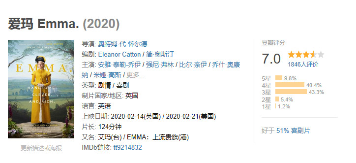 奥斯汀的故事被拍烂,无论《艾玛。》在细节上做了何种尝试,无法跳脱的浪漫喜剧套路仍然限制了发挥空间,在内涵上比起去年《小妇人》中对人物形象和女性特点的深度挖掘来说差了很多,对阶级分化的探讨也浅尝辄止,这也导致它的评分很难高起来,