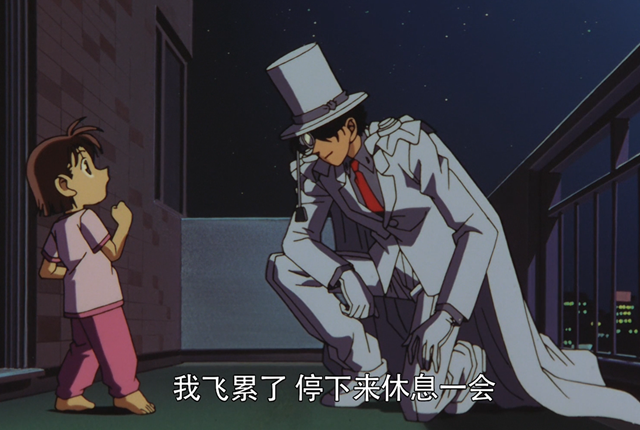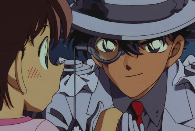 首先是作为主角之一的基德,他在这部剧中的角色自然是要偷彩蛋的人啦。开场就华丽丽地落在步美家的阳台上,极其绅士地亲吻了步美的手,还称她为“小小姐”,紧接着就是用了各种让人摸不着头脑的诡计顺利偷走了彩蛋(当然也及时地被柯南识破了)。唯一让柯南摸不着头脑的是,这次基德预告函的署名是“世纪末的魔术师”,为什么是这个呢?