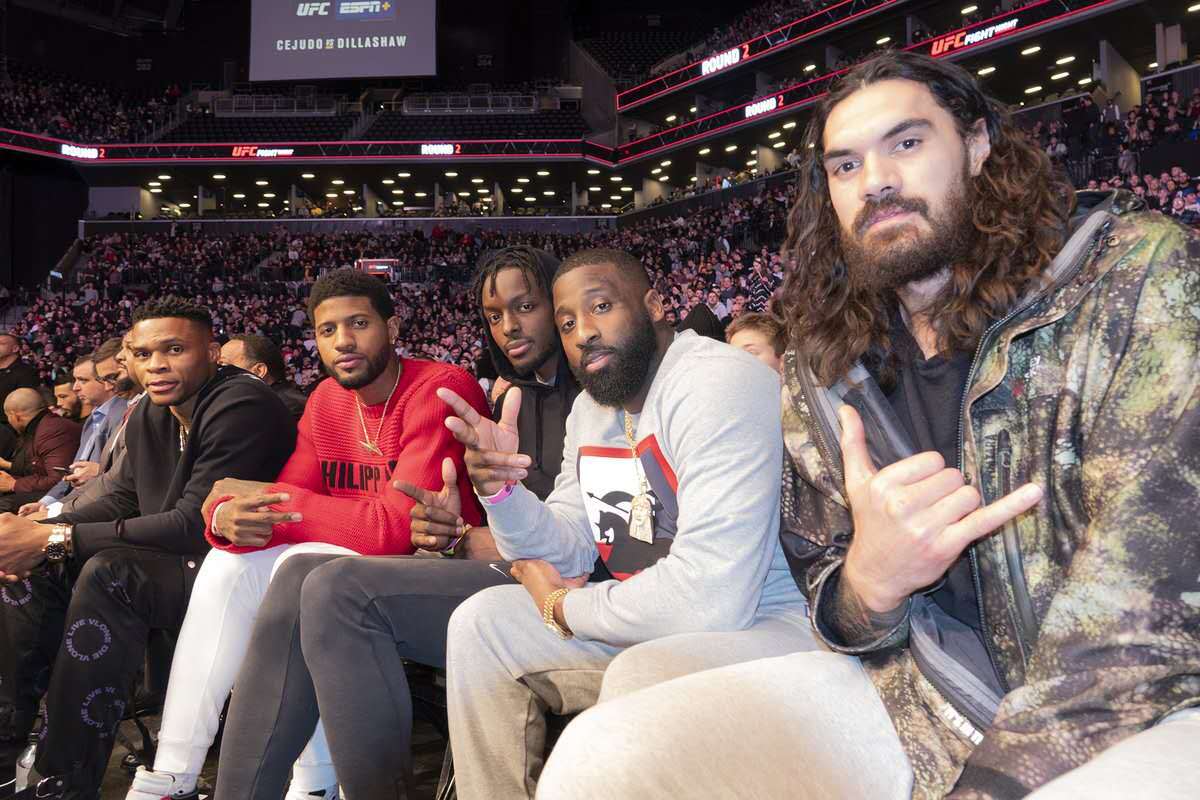 这四个人高马大的家伙并排这么一坐,相信现场镜头想找不到他们都难吧!而他们周围的观众也真幸运,不仅能欣赏激烈的ufc赛事,还能与这四位nba球星合影聊天。