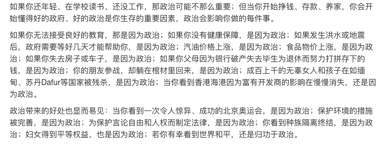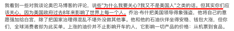 他在博客多次为奥巴马拉票,但是你千万不要认为他只是放个奥巴马演讲视频连接,再写几个“请支持奥巴马,让他成为第一个黑人总统”。他的文章讲究论点和论据,在支持奥巴马之前,先来几段“为什么我关心政治”。