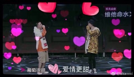 两人合作了《甜葡萄 红眼睛》,歌很好听,但无奈jony j又忘词,让场面一度十分尴尬。这时候,对手兼队友的鬼卞就在旁边题词,还唱了那句“活着是为了创造不是为了胜负”来缓解jony j的压力。
