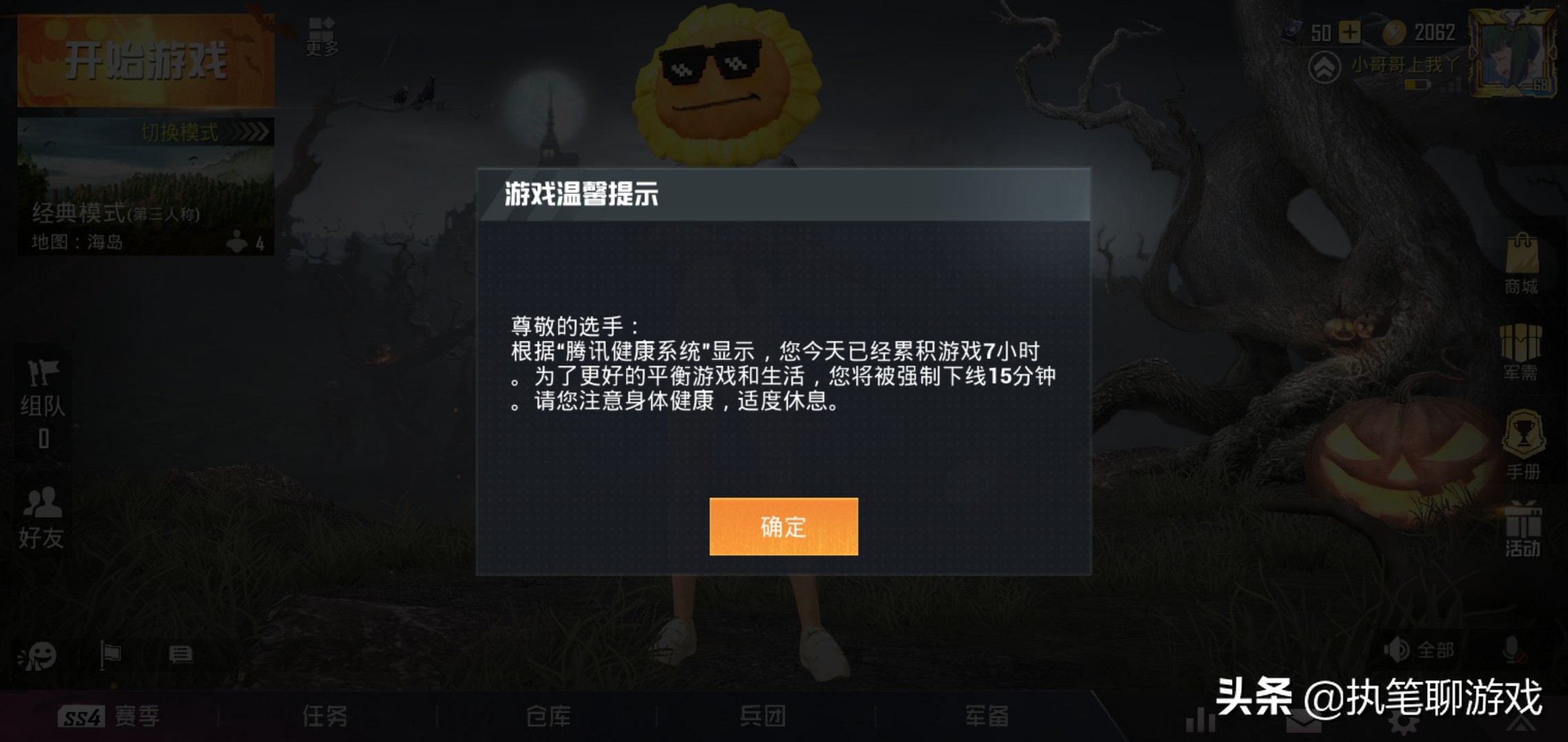有意思的事情是,光子似乎也知道这位玩家连续7个小时的高难度游戏,所以还特意发来了“温馨提示”!如上图所示,大意是说玩家累积游戏7个小时,为了更好的平衡游戏和生火,所以玩家被强制下线15分钟,并且提醒注意身体健康~天哥在这里呢,也希望各位小伙伴们适度休息,合理安排好游戏时间哦~