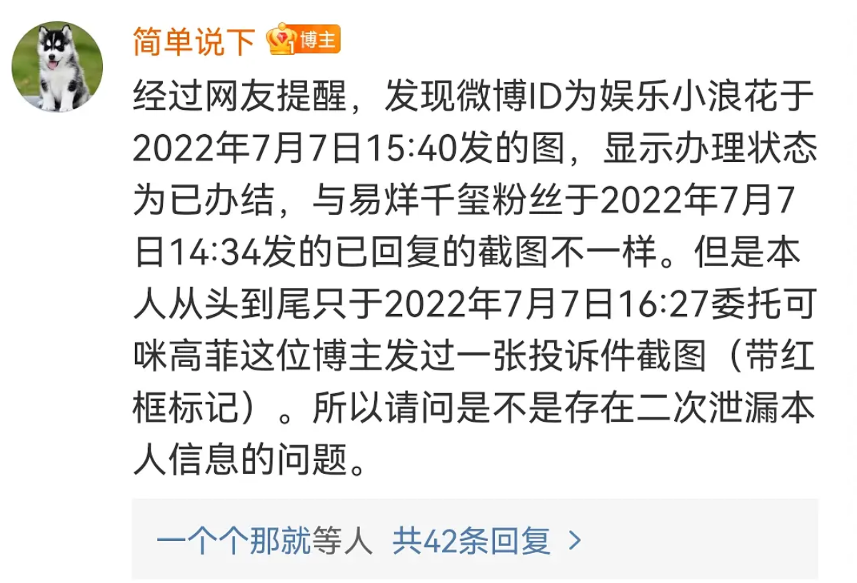 另外,针对易烊千玺后援会澄清其中考的事,所晒出的截图来源,也引发了争议。投诉人也在线发文维权,要求相关方回应是否涉嫌泄露投诉人信息。