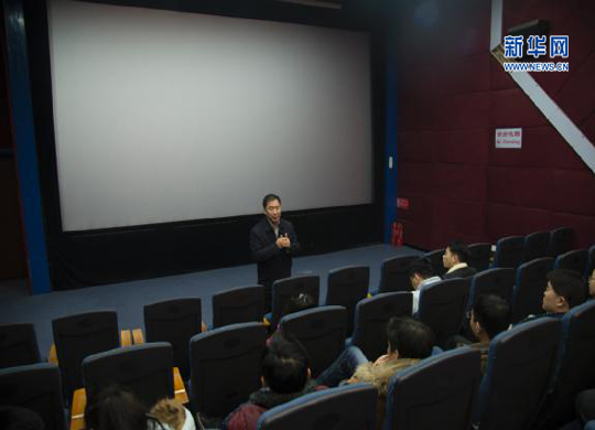 图为原延庆区党委宣传部部长祁金利在电影开场前与观众交流。新华网发 刘品彤 摄