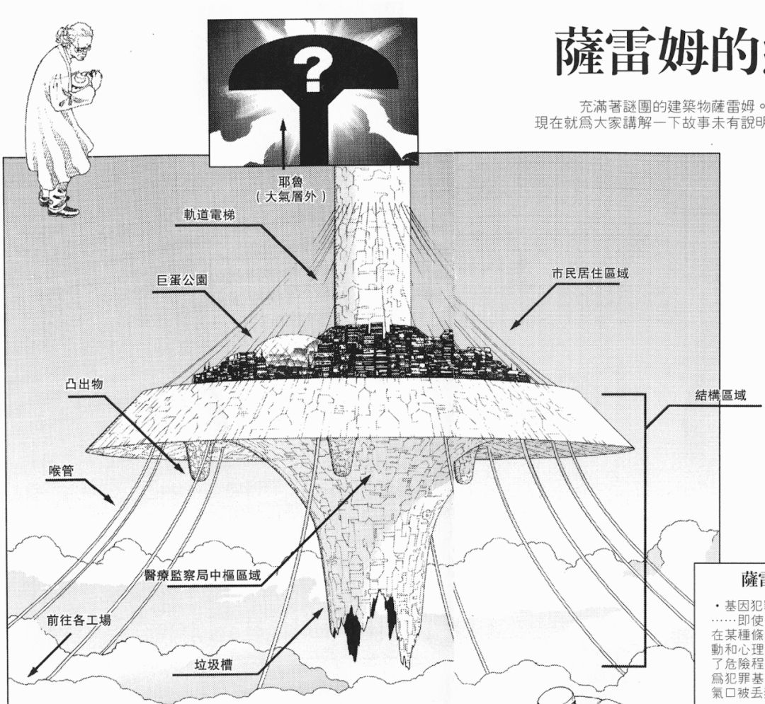 沙雷姆生活的是上等人,在漫画中,沙雷姆曾经和地面相联结,上面住的都是科学家和精英,沙雷姆在一次人为灾难中沙雷姆和地面被切断,这或许和影片中的火星入侵战役有关。