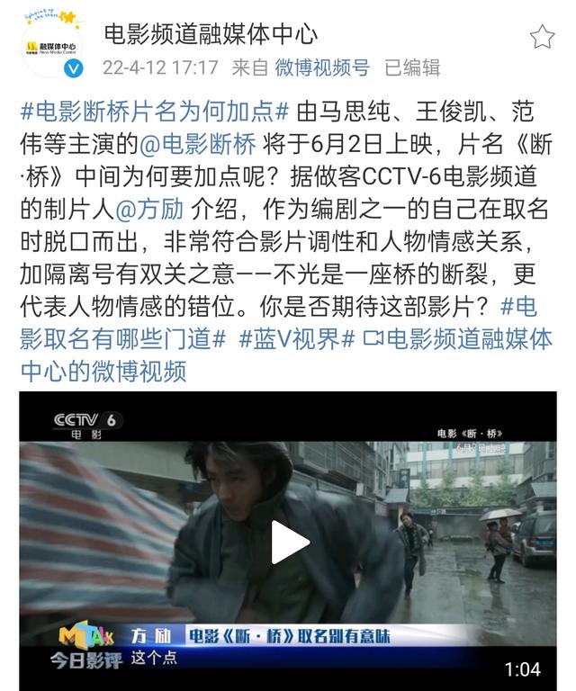 今日,央视电影频道播出了对电影《断·桥》制片人方励的采访。他透露这个特别的片名原来是他的手笔!